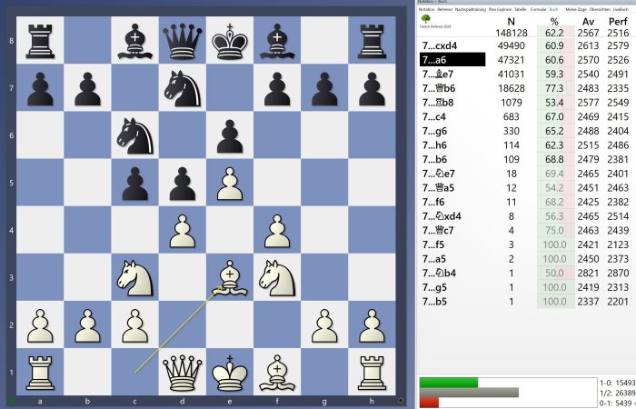 Para la Defensa Francesa Powerbook se empleó material de alta calidad: 730,000 partidas de la Mega y de ajedrez por correspondencia, además de 90,000 partidas del motor de playchess.com. Las estadísticas en la variante Winawer, especialmente en la línea crítica 7.Qg4 Qc7, no favorecen a las negras, lo que explica por qué los grandes maestros raramente optan por esta configuración.