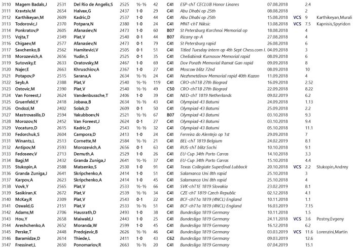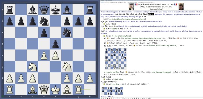 La base de datos muestra una visión general de las partidas. Haz doble clic para cargar una partida. En la pestaña Jugadores, puedes ver quiénes han jugado la mayor cantidad de partidas. Allí encontrarás a especialistas en Philidor como Olexandr Bortnyk (254 partidas), Aleksa Strikovic (216) y Vojtech Plat (199), y podrás estudiar sus partidas.