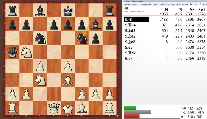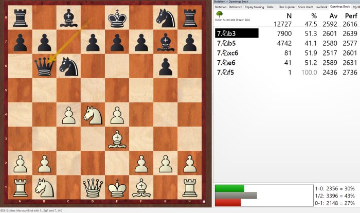 El Powerbook del Dragón Acelerado Siciliano también permite realizar descubrimientos interesantes. Por ejemplo, tras las jugadas 1.e4 c5 2.Cf3 g6 3.d4 cxd4 4.Cxd4 Ag7 5.c4 Cc6 6.Ac3, la respuesta 6...Db6