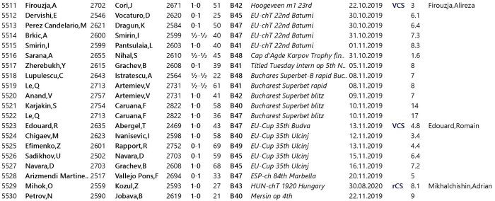 Con un doble clic en la base de datos, se abre la vista general de las partidas. Otro doble clic permite acceder a la partida seleccionada. La pestaña Jugadores permite ordenar las partidas según su frecuencia (en la pestaña Total), facilitando así el análisis de partidas de jugadores como Caruana o Svidler.