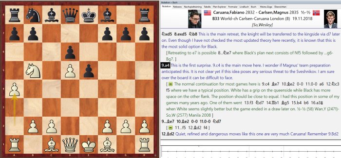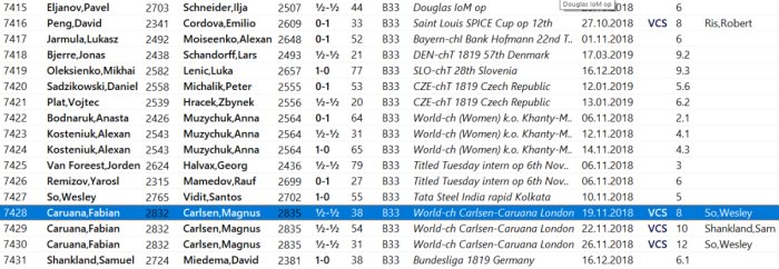 La base de datos ofrece un resumen de las partidas. Con un doble clic puedes abrir una partida. La pestaña de Jugadores permite ordenar las partidas según la frecuencia, lo que facilita examinar en detalle a jugadores como Magnus Carlsen, Sergei Zhigalko y Michal Krasenkow (expertos con las piezas negras), o Shirov y Kramnik (especialistas con ambas piezas).