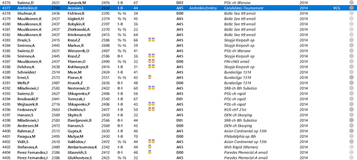 La base de datos muestra un resumen de las partidas. Para abrir una partida, solo es necesario hacer doble clic. En la pestaña Players se pueden ordenar las partidas según su frecuencia, lo que permite enfocarse en jugadores destacados como Julian Hodgson (257 partidas), Antoaneta Stefanova (168), Dmitry Andreikin (160), Hikaru Nakamura (148) o Shakhriyar Mamedyarov (121), todos expertos en el Ataque Trompowsky.