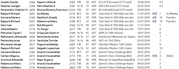 La base de datos muestra una vista general de las partidas. Haz doble clic para cargar una partida. Puedes ordenar las partidas según su frecuencia en la pestaña de jugadores, lo que permite analizar en detalle a jugadores como Nakamura, Jobava y Amin.
