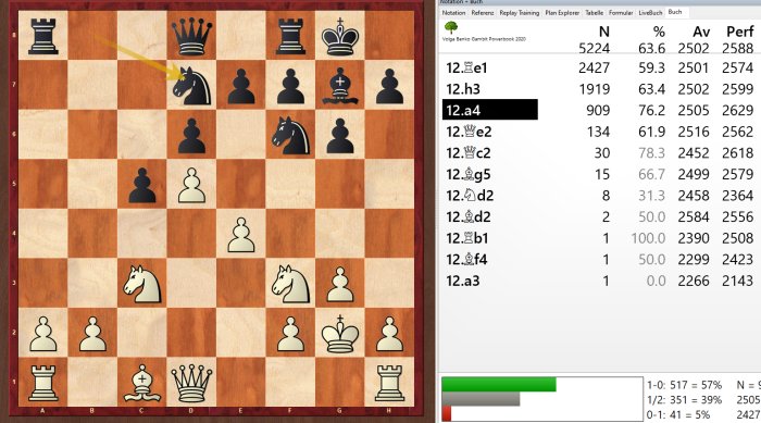 Sin embargo, ahora las blancas no deberían elegir la jugada más frecuente, sino la estadísticamente más efectiva – 12.a4! – que genera serias dificultades para las negras. Movimientos típicos posteriores son Nb5 y Ra3. Por ello, las negras deberían desviarse antes, quizás postergando ...Bxa6, por ejemplo: 6...Bg7 7.e4 0-0 8.Nf3 Qa5!
