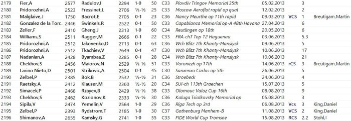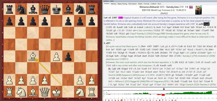 La base de datos muestra un resumen de las partidas. Al hacer doble clic, se carga una partida. La pestaña Players permite ordenar las partidas según su frecuencia, lo que facilita un análisis detallado de jugadores como Heikki Westerinen, Joseph Gallagher y Alexei Fedorov (todos expertos con las piezas blancas), así como Boris Spassky y David Bronstein. Estas dos leyendas rusas jugaron ocasionalmente la Apertura del Gambito de Rey. De hecho, el décimo campeón mundial tiene un récord especial: solo perdió una partida con esta arriesgada apertura, y fue en una simultánea.