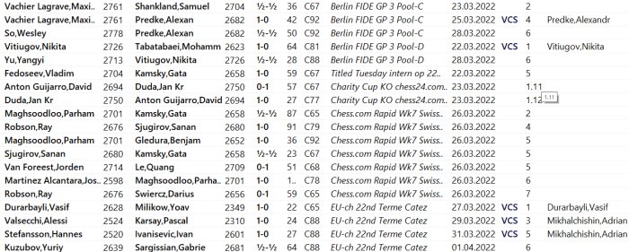 La base de datos muestra un resumen de las partidas. Para cargar una partida, haz doble clic. En la pestaña Jugadores, puedes ordenar las partidas según la frecuencia, permitiendo analizar a jugadores como Viswanathan Anand (684 partidas), Michael Adams (667) y Fabiano Caruana (668), todos expertos tanto con piezas blancas como negras.