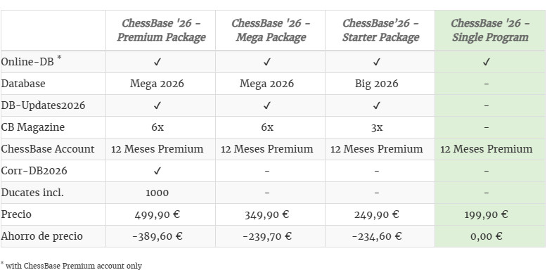 ChessBase es una base de datos de ajedrez personal e independiente que se ha convertido en el estándar mundial. Todo el mundo usa ChessBase, desde el Campeón del Mundo hasta el aficionado de al lado. Es el programa preferido por cualquiera que ame el ajedrez y quiera aprender más sobre él. Comienza tu propia historia de éxito con ChessBase y disfruta aún más del juego. ¡Nueva versión '26! Mira más abajo todas las novedades.