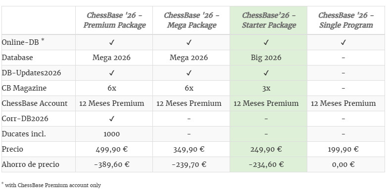ChessBase es una base de datos de ajedrez personal e independiente que se ha convertido en el estándar mundial. Todo el mundo usa ChessBase, desde el Campeón del Mundo hasta el aficionado de al lado. Es el programa preferido por cualquiera que ame el ajedrez y quiera aprender más sobre él. Comienza tu propia historia de éxito con ChessBase y disfruta aún más del juego. ¡Nueva versión '26! Mira más abajo todas las novedades.