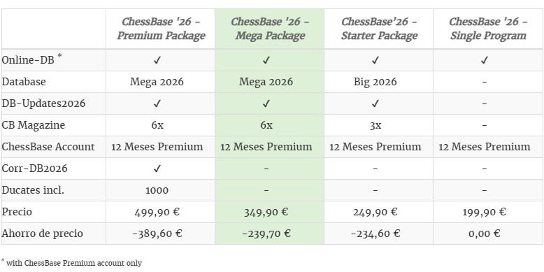 ChessBase es una base de datos de ajedrez personal e independiente que se ha convertido en el estándar mundial. Todo el mundo usa ChessBase, desde el Campeón del Mundo hasta el aficionado de al lado. Es el programa preferido por cualquiera que ame el ajedrez y quiera aprender más sobre él. Comienza tu propia historia de éxito con ChessBase y disfruta aún más del juego. ¡Nueva versión '26! Mira más abajo todas las novedades.